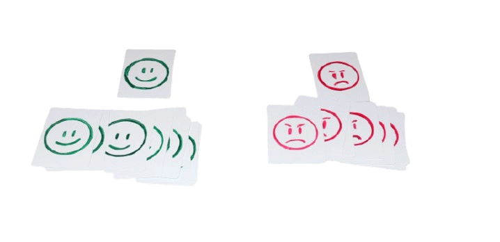 Les digo que las cartas tienen EMOCIONES. Algunos sonríen, otros están tristes. Y necesito que ellos me ayuden a poner orden: que los alegres vayan a un lado, y los tristes al otro.